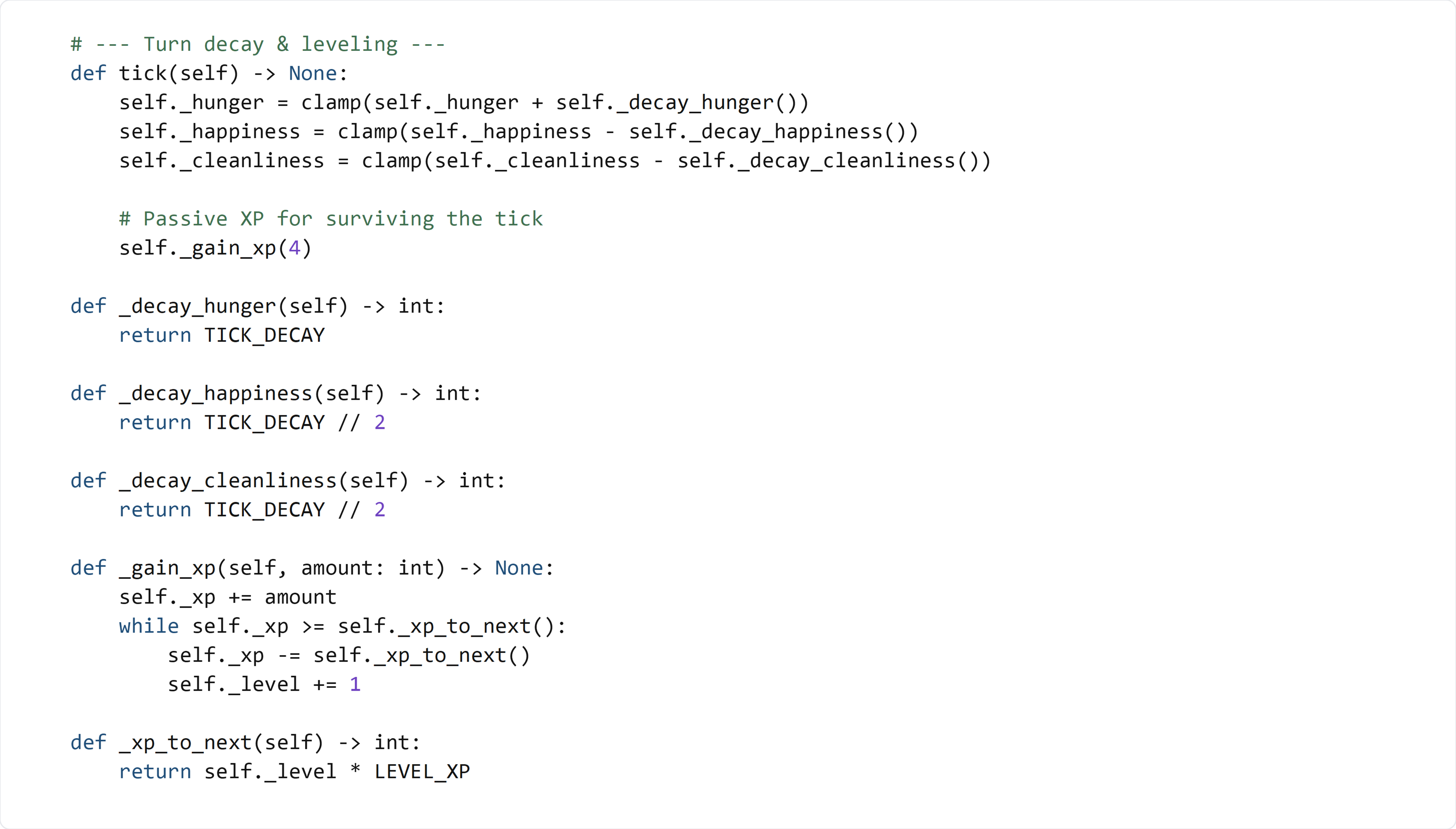 tick()should increase hunger and decrease happiness/cleanliness- The +4 XP pushes the pet over the level-up threshold