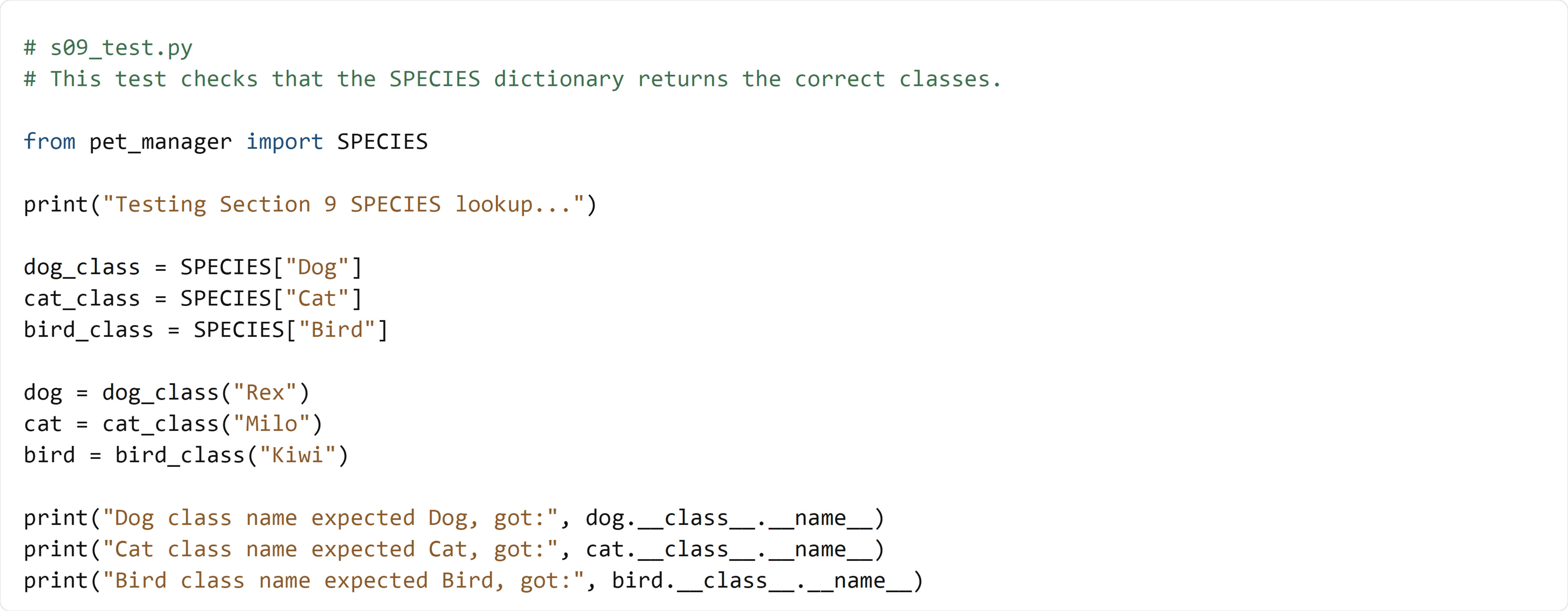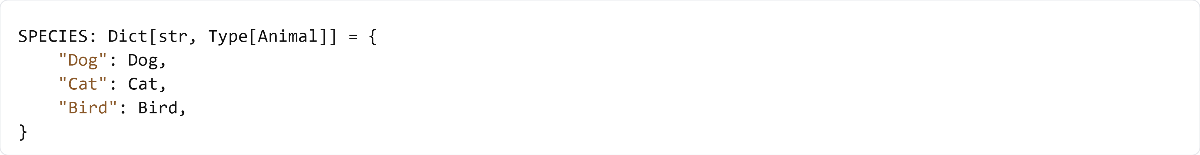 SPECIESdictionary below the animal classes - Store classes as dictionary values