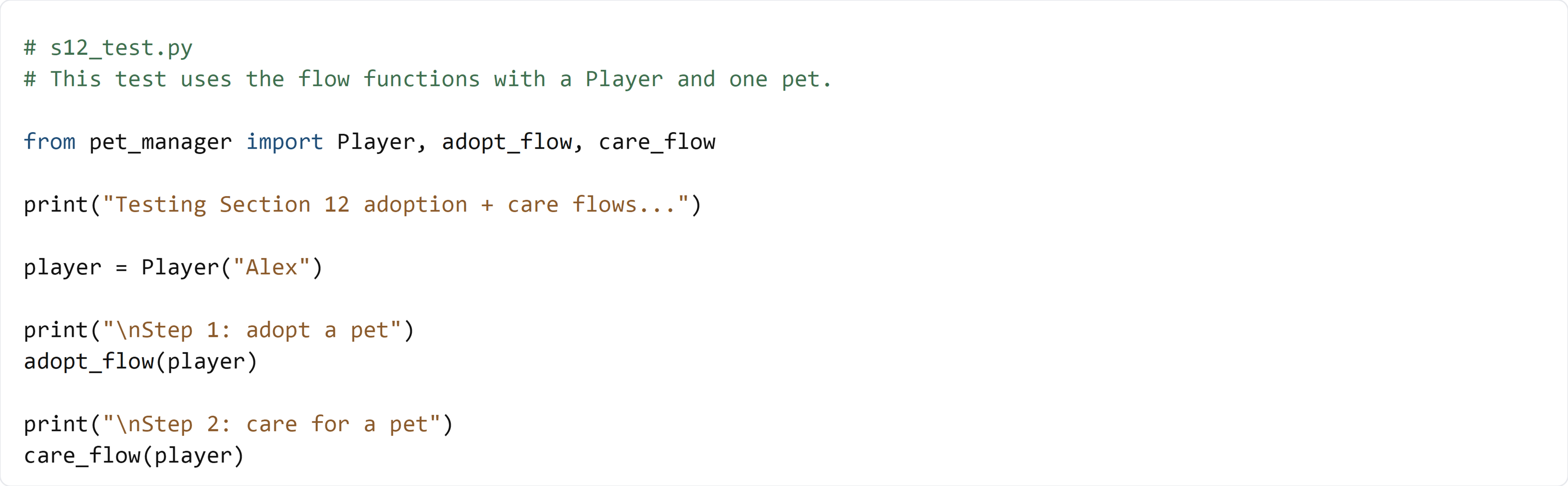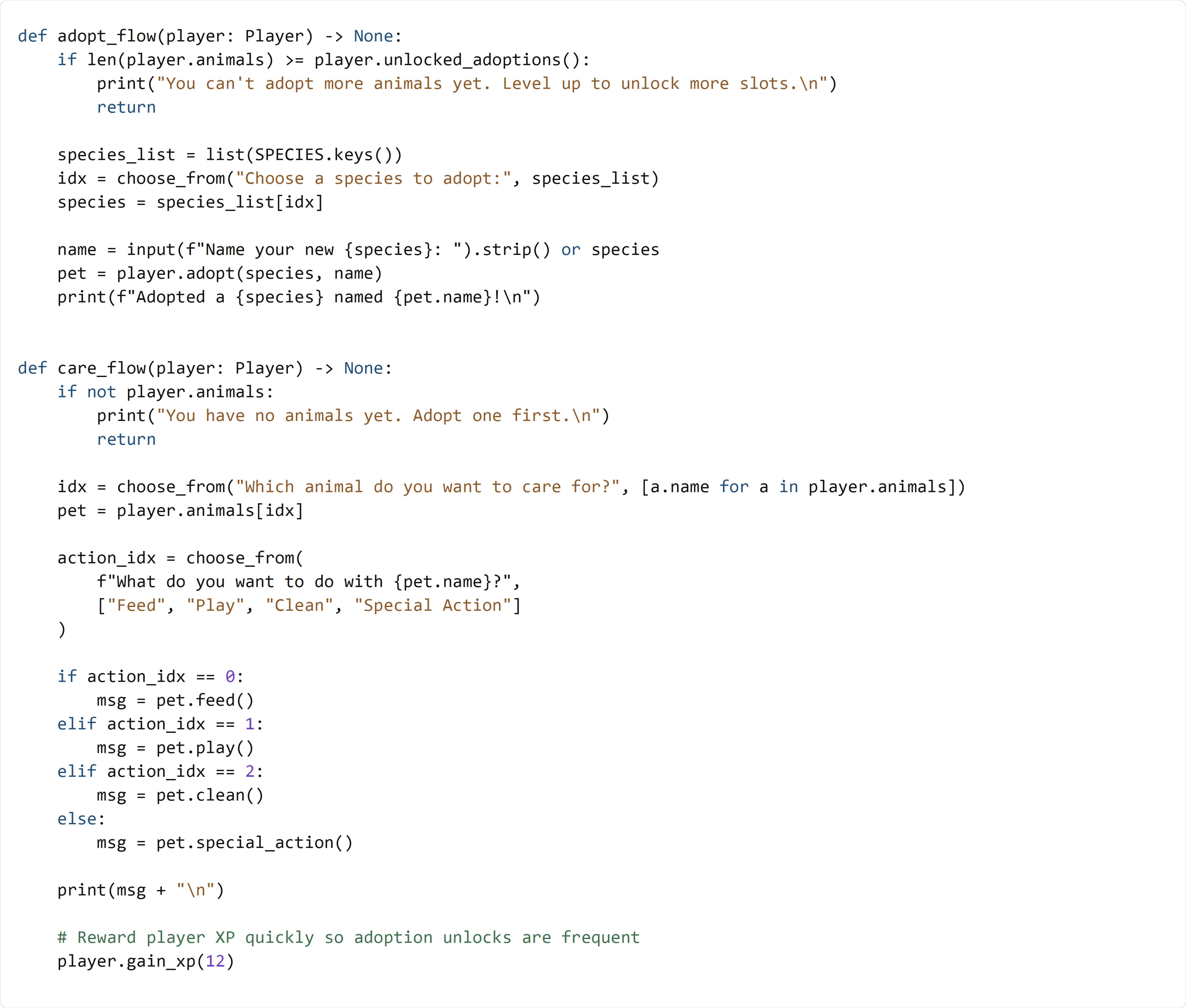 care_flow()so you can choose an action for the pet - You should see the correct messages printed after each choice