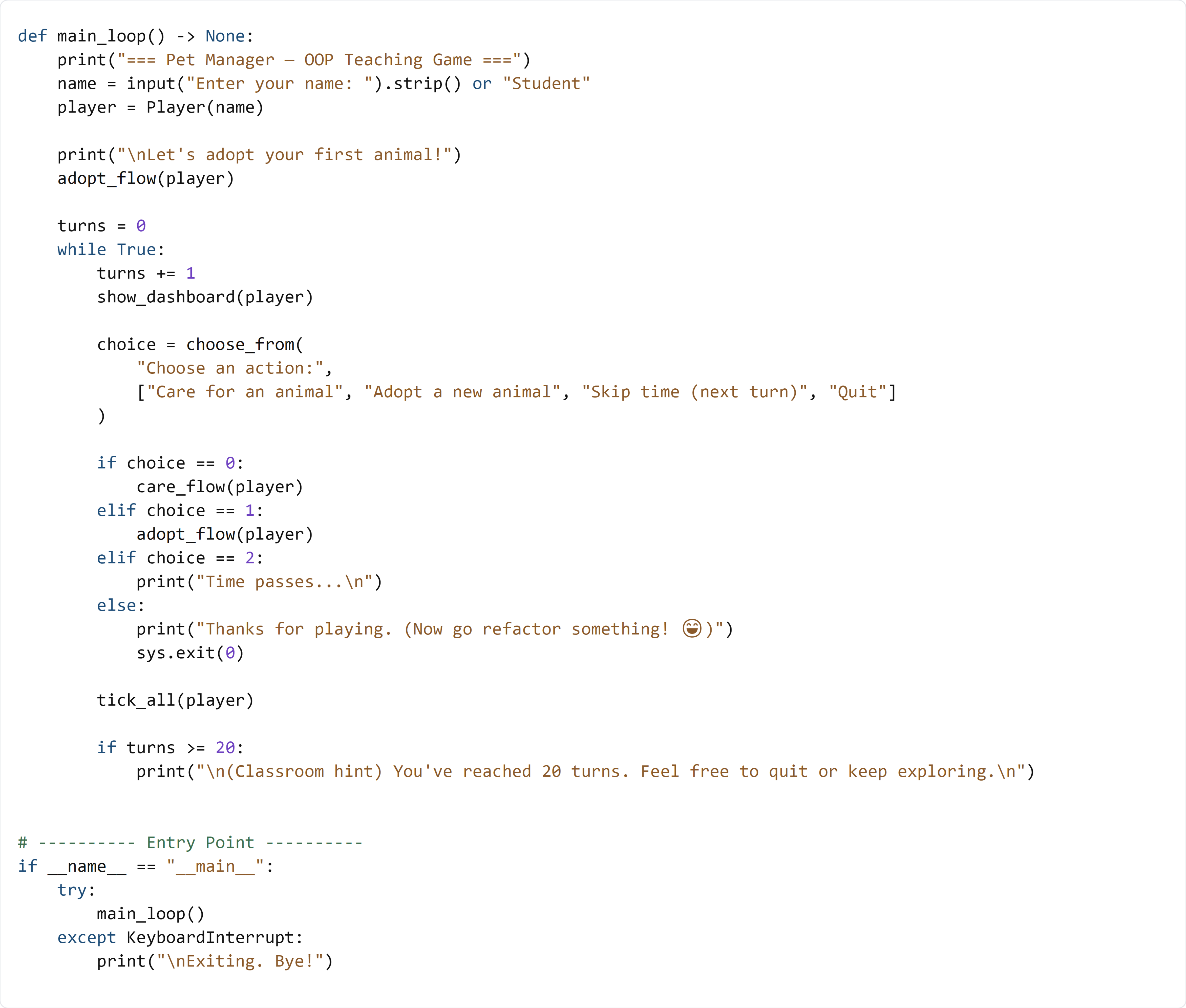 show_dashboard()to display infochoose_from()to get a valid menu choicecare_flow()oradopt_flow()to run actionstick_all()to advance time
